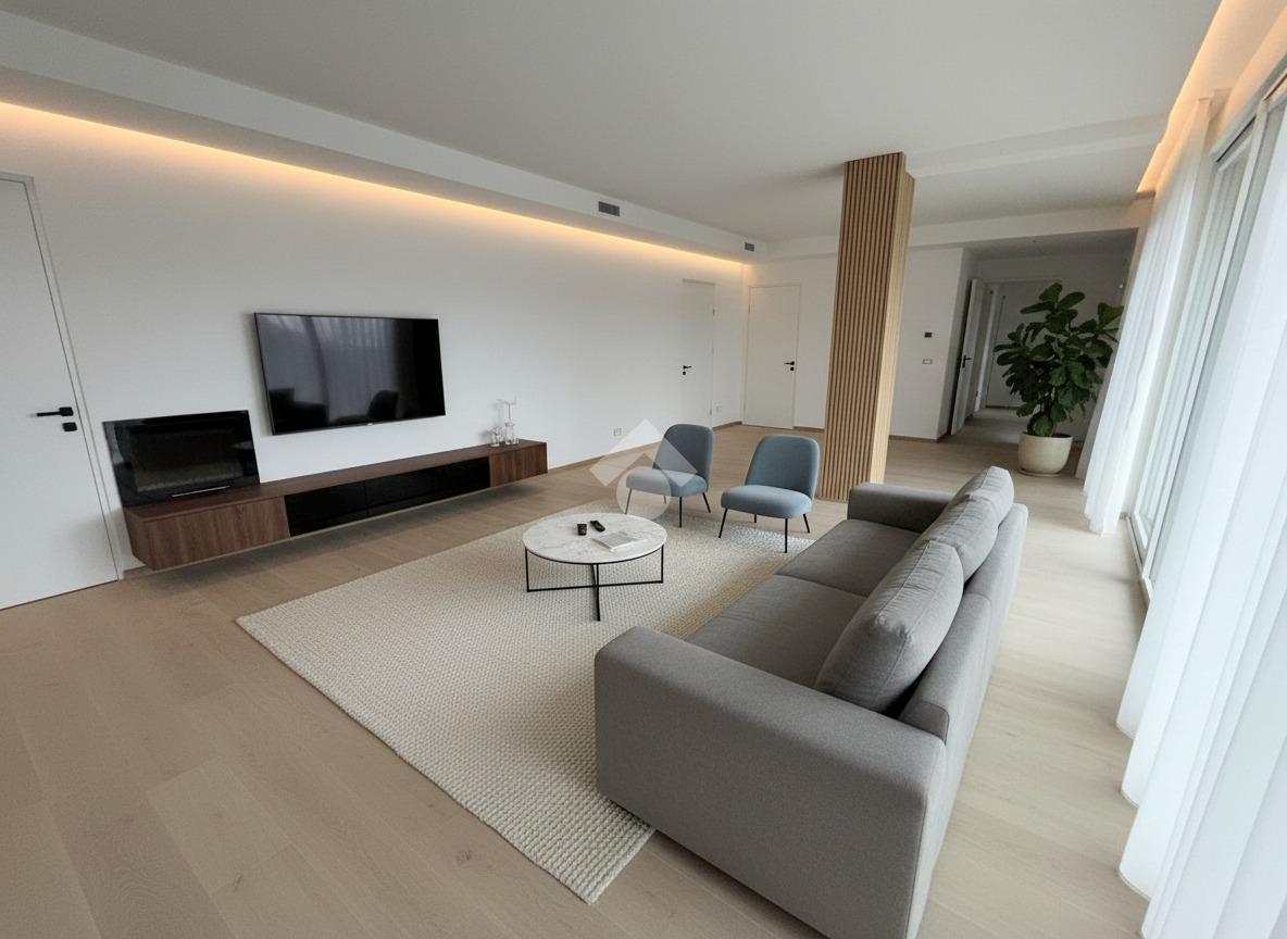 Ampia zona giorno open-space con cucina a vista, due camere da letto, bagno finestrato con box doccia e lavanderia.